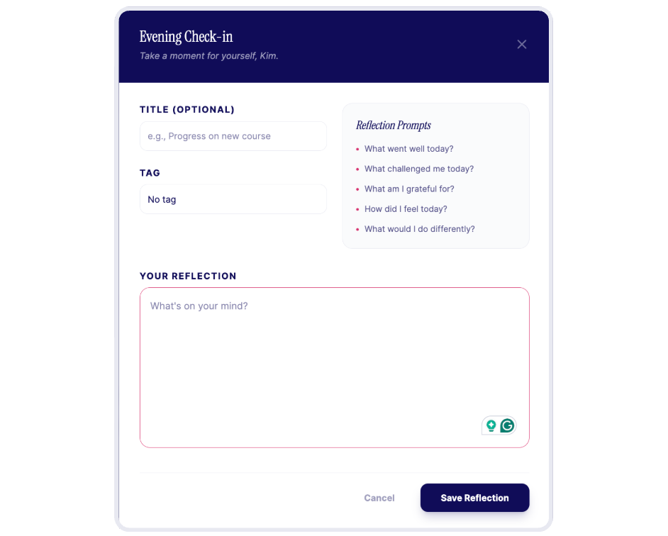 There’s an Evening Check-in card. One click and I’m in a simple reflection flow — optional title, optional life-area tag, prompts like “What went well today?” and “What challenged me?” I can write a few sentences and save.